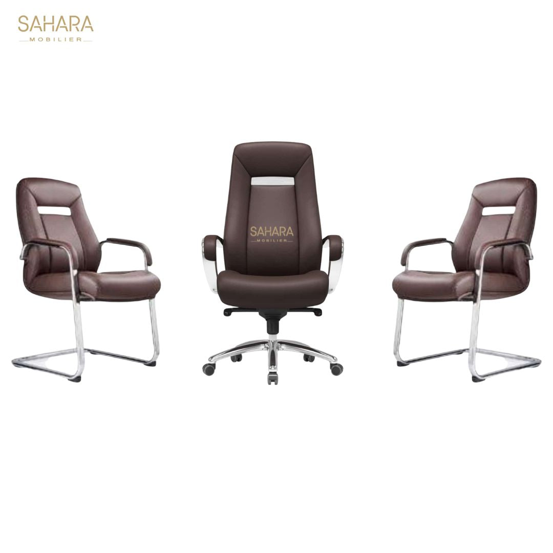 www.saharamobilier.ma Le Fauteuil président est composé de : - Un dossier en Simili cuir qui dispose d’un support lombaire intégré et une têtière incorporée- Une assise...