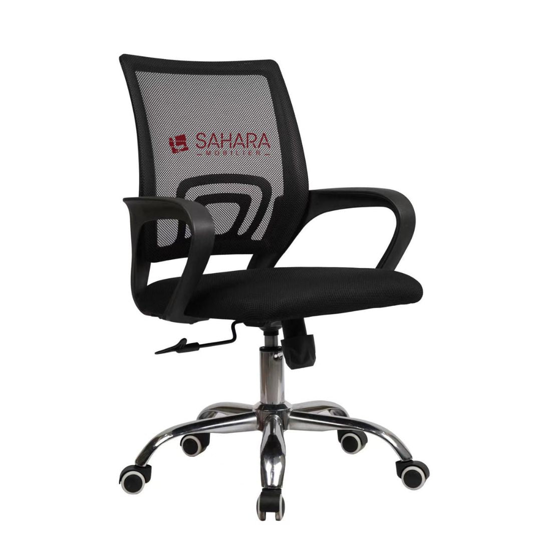 Fauteuil opérateur avec support lombaire les accoudoirs fixes Les piètement chromé L'assise réglable au niveau de la hauteur