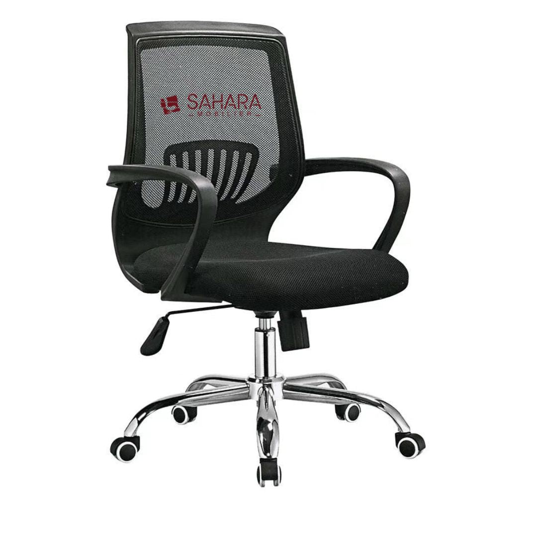 Fauteuil opérateur confort Dossier en tissu mesh Assise en tissu noir Réglable en hauteur Ajustable Système basculant Branche Chrome avec roulettes Accoudoirs en polyuréthane Fauteuil opérateur...