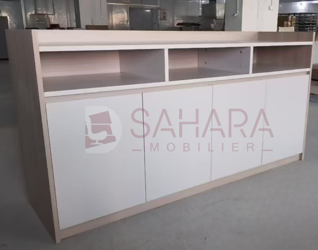Meuble de Présentation et de Rangement Polyvalent Caractéristiques : Matériau : Panneau de particules recouvert de stratifié, offrant robustesse et durabilité. Couleur : Finition bois naturelle,...