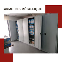 Armoire métallique, avec 4 étagères (tablettes)- Chaque tablette support jusqu’à 35 kg- Portes pliantes avec serrure- Dimensions : H 2m x L 1,2m x P 0,42...