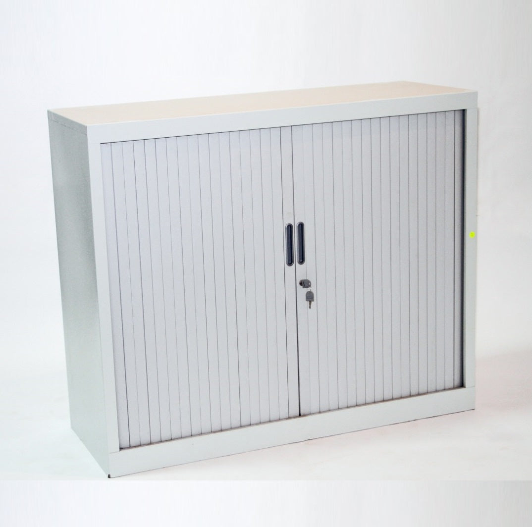 Armoire basse à rideaux : • Structure monobloc soudé en usine• Acier de 7/10ème recouvert d'une peinture époxy• Rideaux à lamelles PVC escamotables• Poignées et serrure...