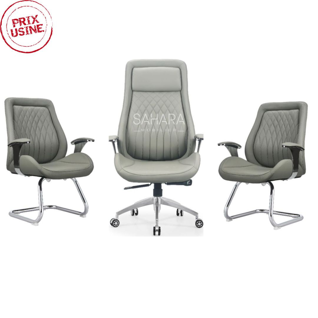 Fauteuil de Direction et Chaises Visiteurs (Gris) Fauteuil de Direction : Design : Ergonomique avec un dossier haut pour un confort optimal. Structure : Base chromé...