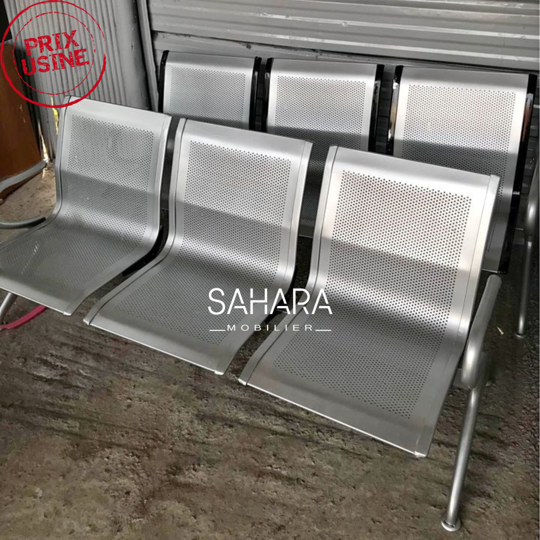 Banquette de réception 3 places Galvanisée avec 2 accoudoirs. Structure en aluminium robuste ( poutre, dossier, assises et 2 accoudoirs). Assise et dossier en Métal perforé non revêtus en cuir Polyuréthane (PU). Piétement en aluminium avec sabot de stabilité