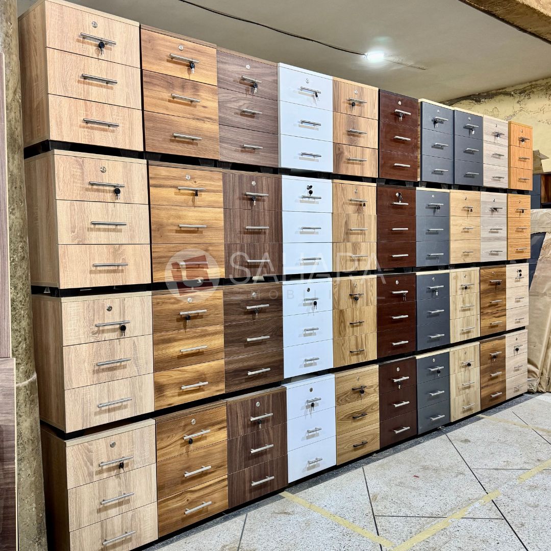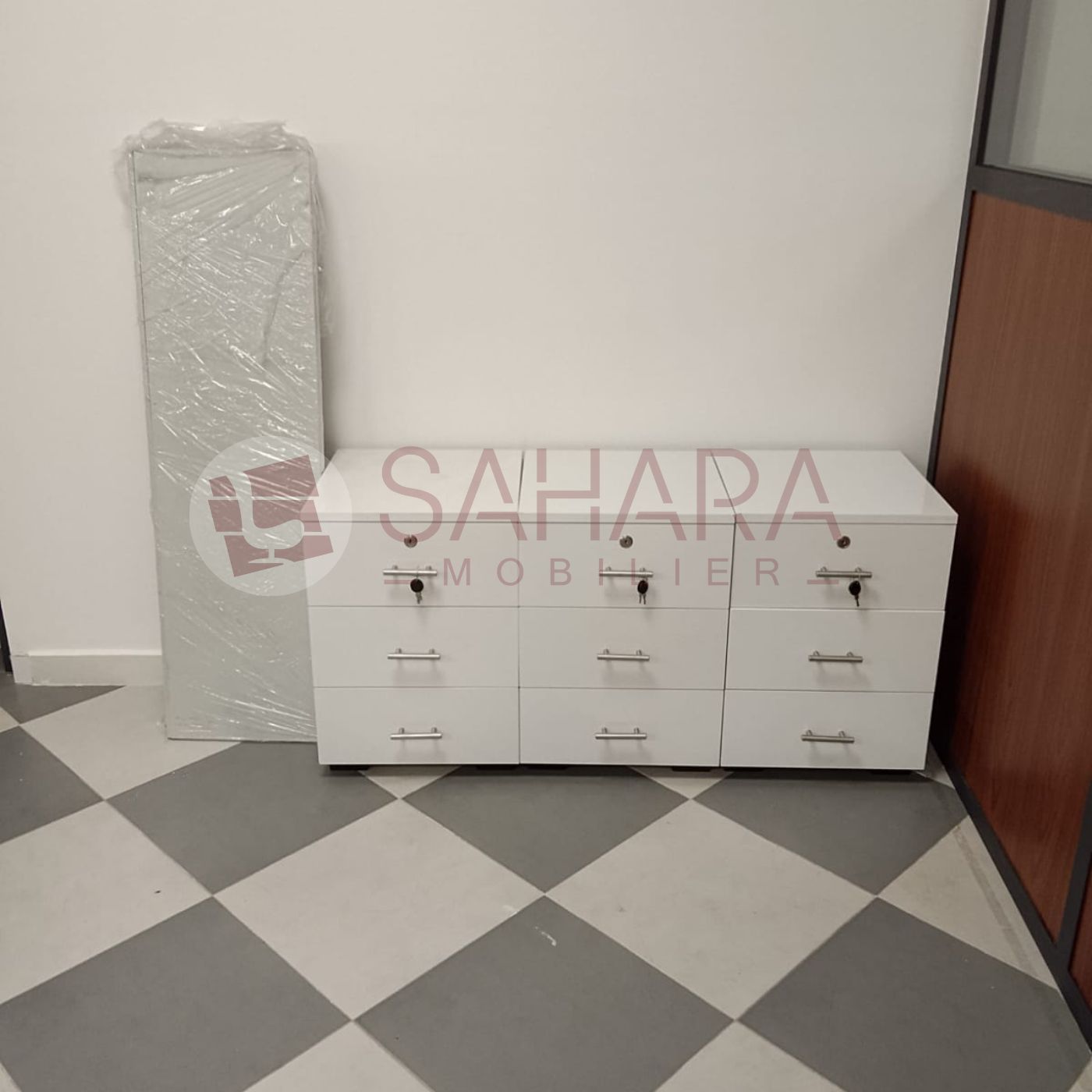 Top et tiroirs en bois mélaminé ép.19mm chant en ABS ép.0.8mm.