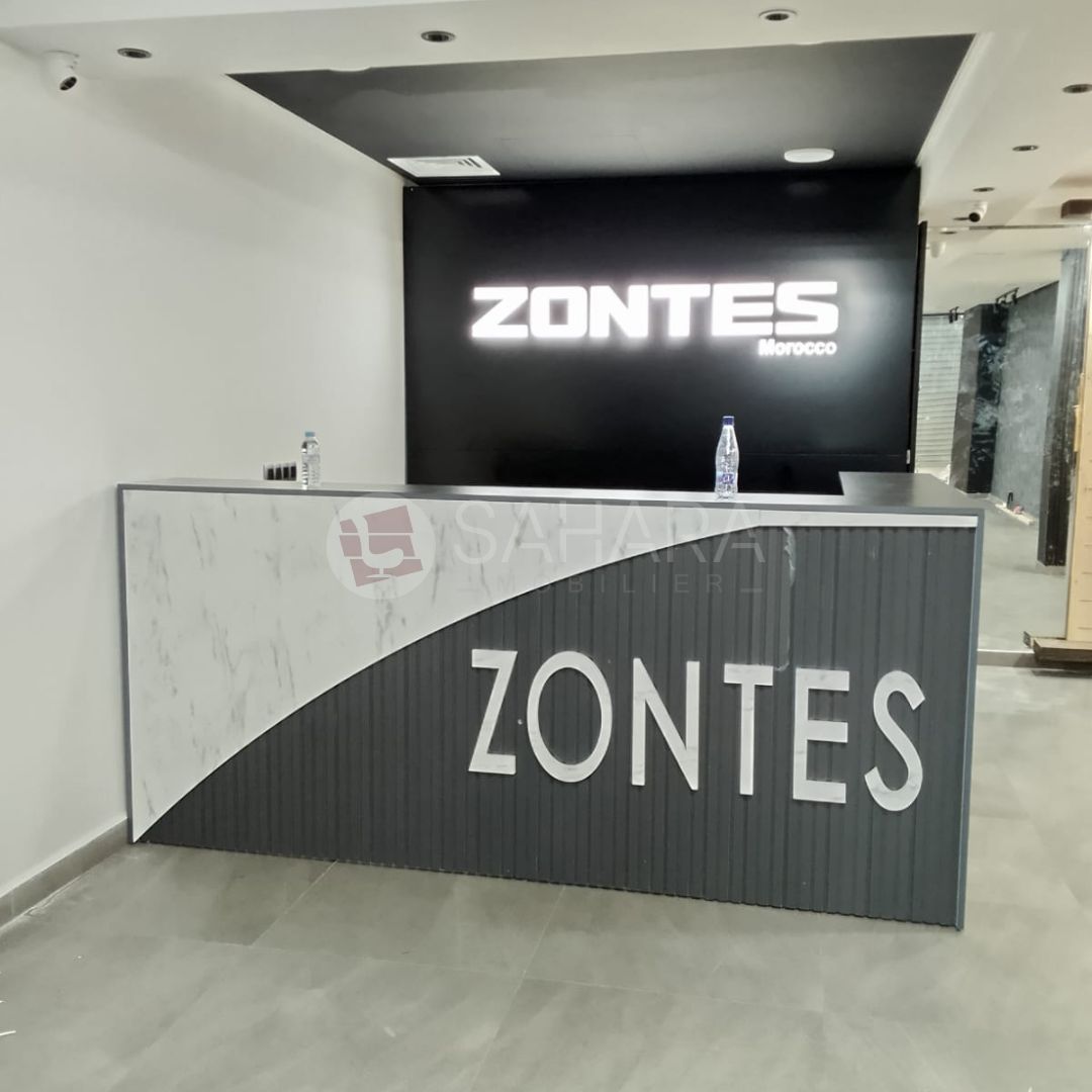 Avec sa combinaison de bois naturel et de noir mat, ce comptoir de réception offre un look raffiné tout en maximisant l’espace d’accueil. Sa conception ergonomique permet une interaction fluide avec les visiteurs, tout en s’adaptant aux besoins de rangement et d’organisation du personnel.