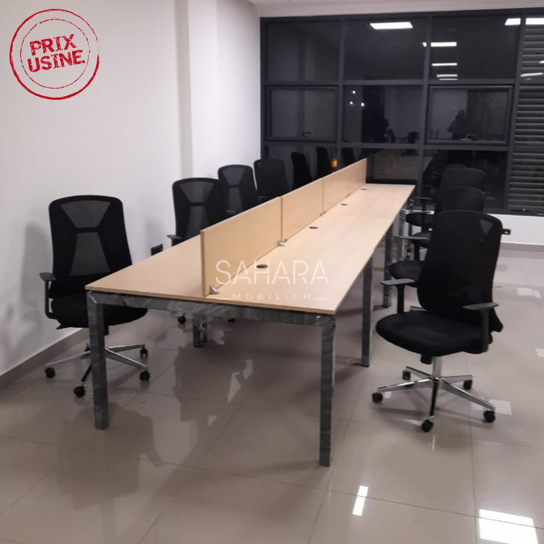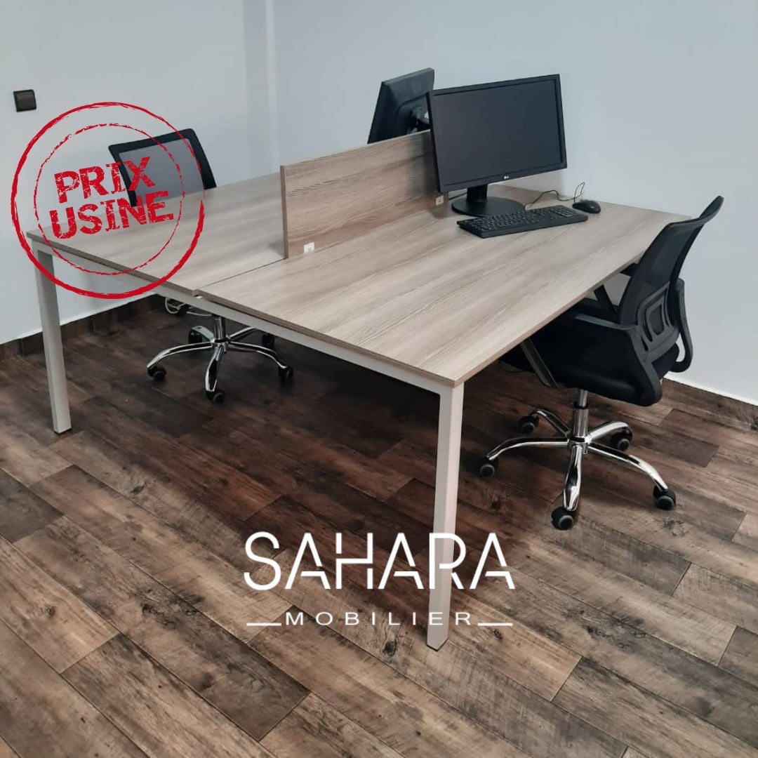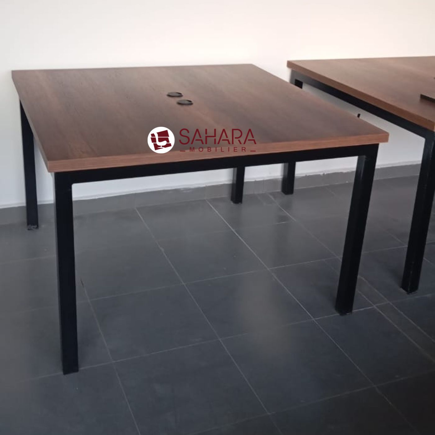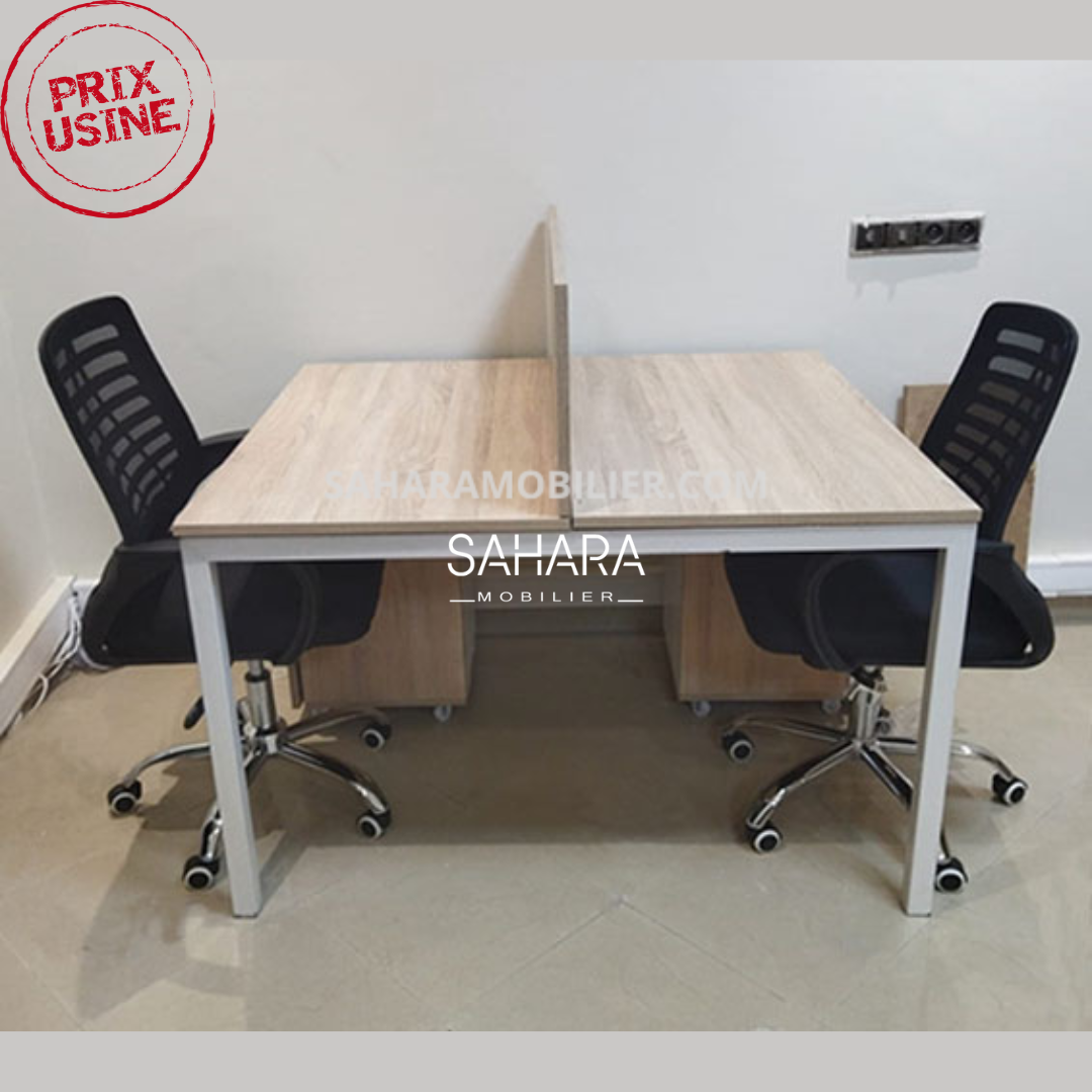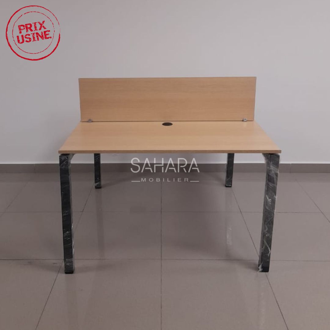Margueritte 2 places Diamètre : 120cm x120cm équipé d'un plan de travail en bois mélamine, ép. 19 mm Piétement métallique à forme L  avec embouts, 2passes câbles ronds, écrans de séparation en bois mélamine ép. 19 mm