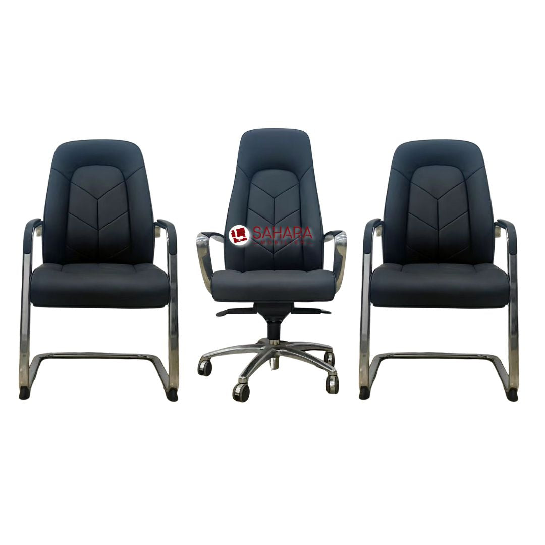 Ce pack de fauteuils de bureau en simili cuir est conçu pour apporter confort et élégance à votre espace de travail. Il comprend un fauteuil de direction ergonomique et deux fauteuils visiteurs assortis, idéaux pour les bureaux professionnels et les salles de réunion.