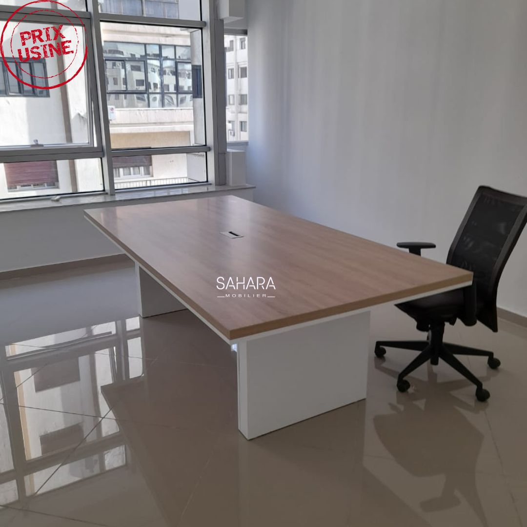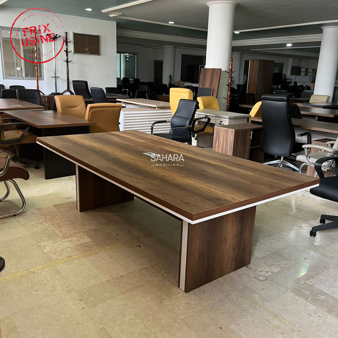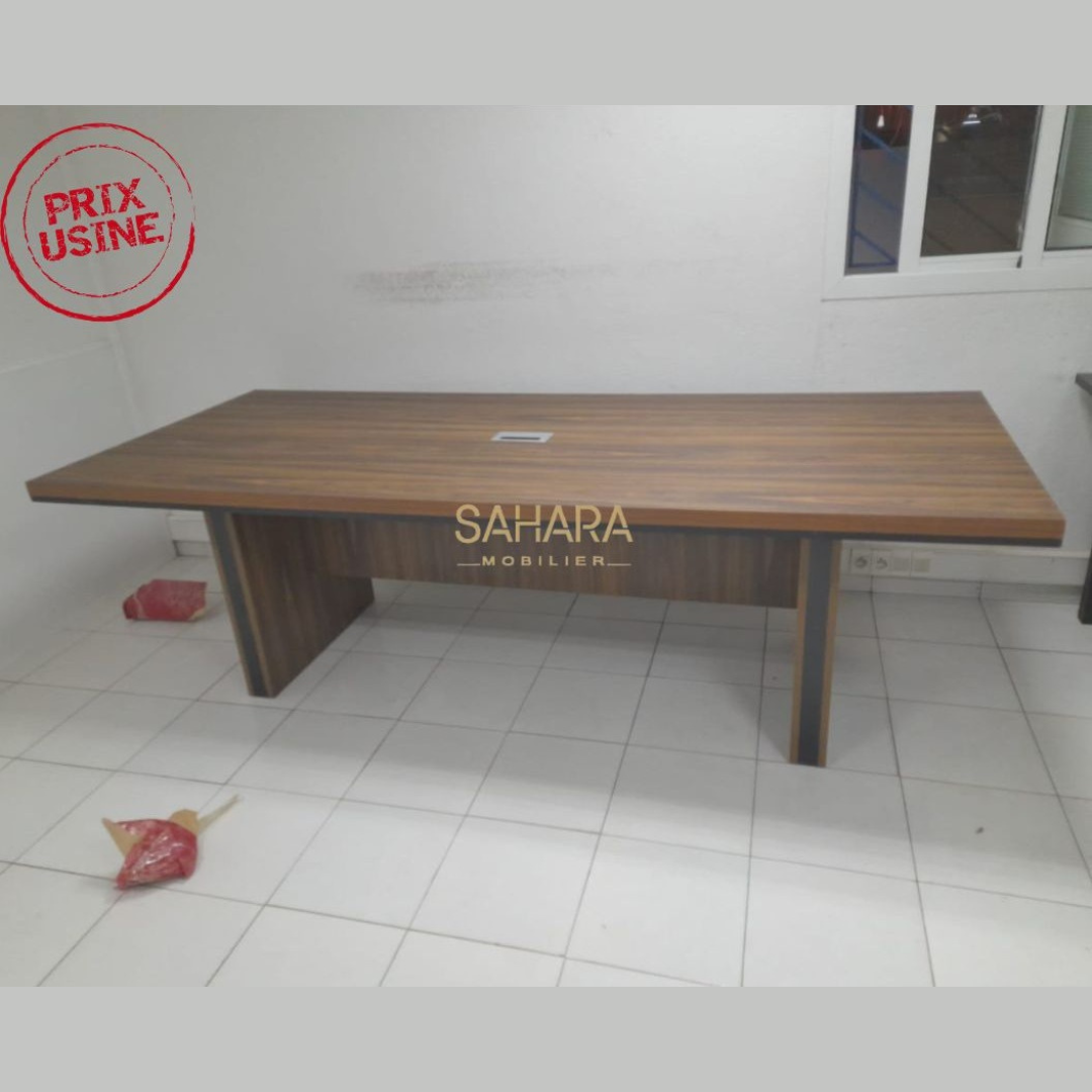 - Plateau en bois mélamine de dimension 2400x1200mm et d’épaisseur 45mm avec chant en 0.8 mm posé sur deux piètements panneaux de même finition et épaisseur